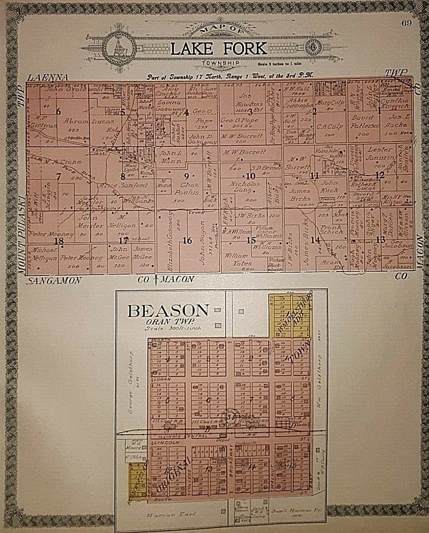 1910 Original Railroad & Plat Map ~ LAKE FORK BEASON Twp. LOGAN